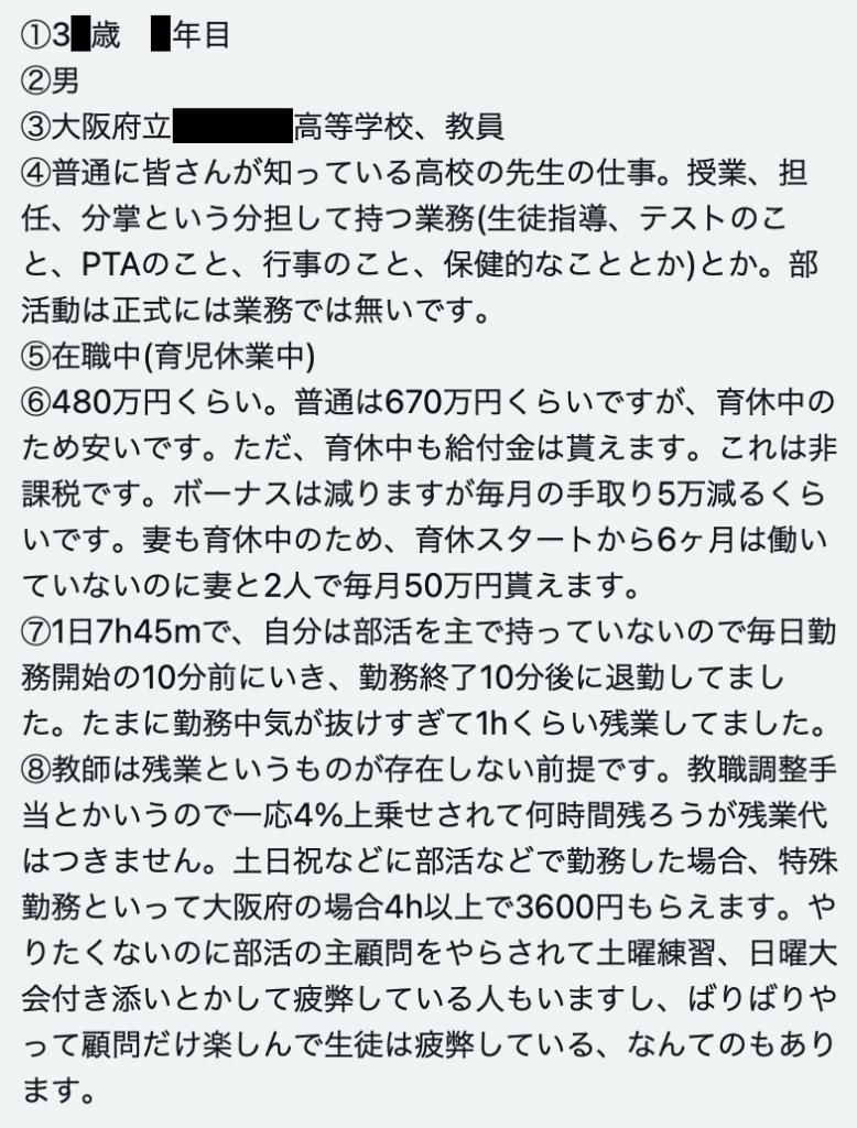大阪府にある公立高校でホワイトな働き方をしている現在育休中教員(院卒入社30代前半で年収480万円)