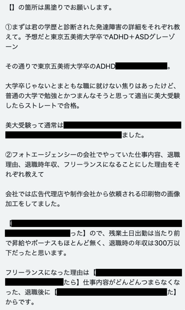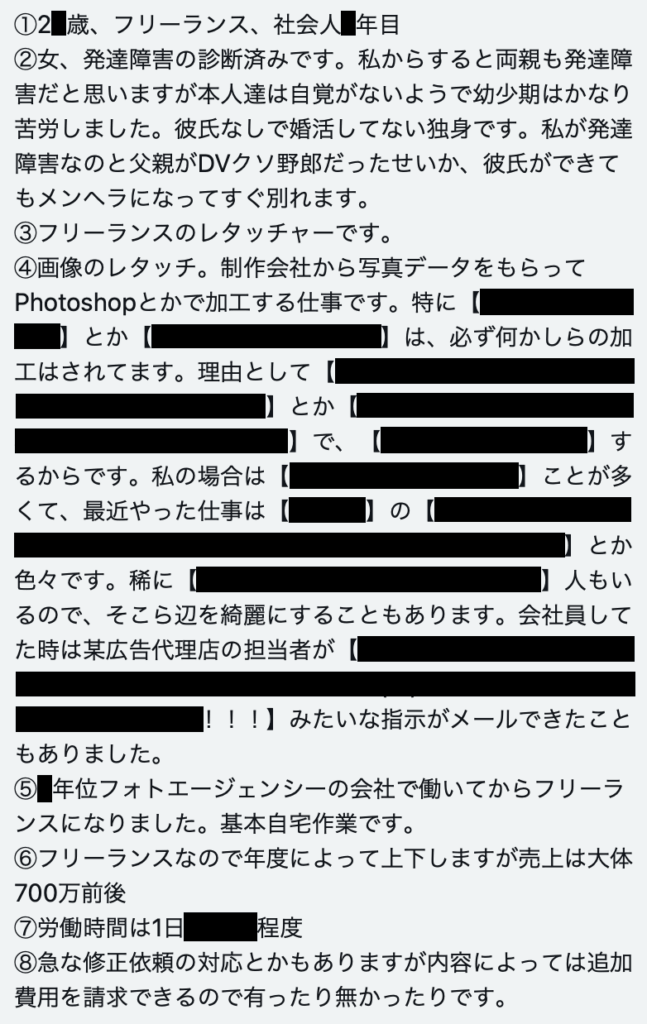 【フリーランスのレタッチャーしてる毒親育ち発達障害メンヘラ女】20代後半で売上760万円の女性から給与明細を買い取らせて頂きました。両親もおそらく発達障害。実家はゴミ屋敷で父から暴力、母からヒステリーを受けて育った。発達障害は遺伝するし毒親になるから子供作らないように!とのことです。 pic.twitter.com/RYpS1LBZVd