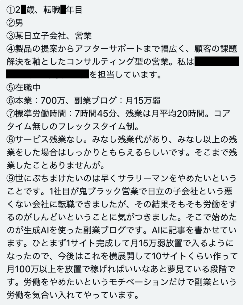 【生成AIで書いた副業ブログで月15万円を放置で稼ぐ日立くん】転職入社20代後半で年収700万円+副業アドセンスの男性から給与明細を買い取らせて頂きました。悪くない日立の子会社に転職出来て気がついた。そもそも労働したくないことに。この月15万を月100万以上にして労働から脱出するとのことです。 pic.twitter.com/bbeT77KgCw
