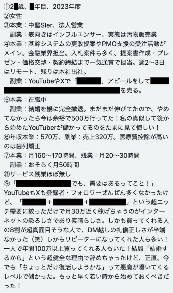 【汚物販売の副業で320万円も稼ぐSIerの営業女】大卒入社20代後半で本業570万円で副業320万円の女性から給与明細を買い取らせて頂きました。まだまだ伸びていたが結婚が決まったからやめた。やめなかったら今頃は500万行ってた。汚物の詳細も書いといたから独身女性は参考にするように!とのことです。 pic.twitter.com/9GaM5T2O8z