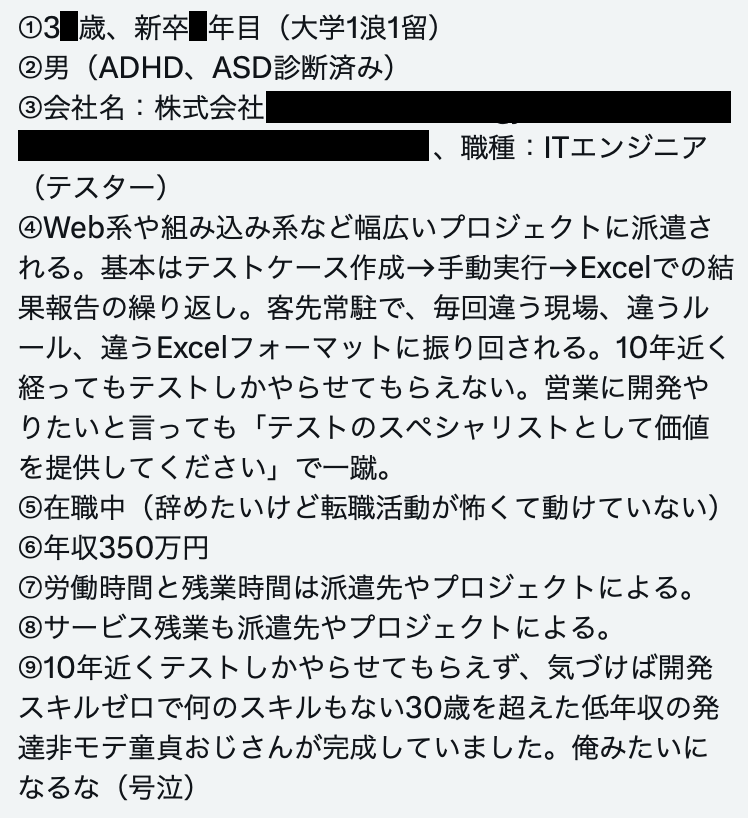 【東京男子御三家中高→旧帝大→低年収発達障害童貞おじさん】大卒入社30代前半で年収350万円の男性から給与明細を買い取らせて頂きました。10年近くずっと底辺SESでテスターをしている。気づけば開発スキルゼロで何のスキルもないまま30歳を超えた。高学歴でも私のような底辺は存在するとのことです。 pic.twitter.com/7Caoojdza1