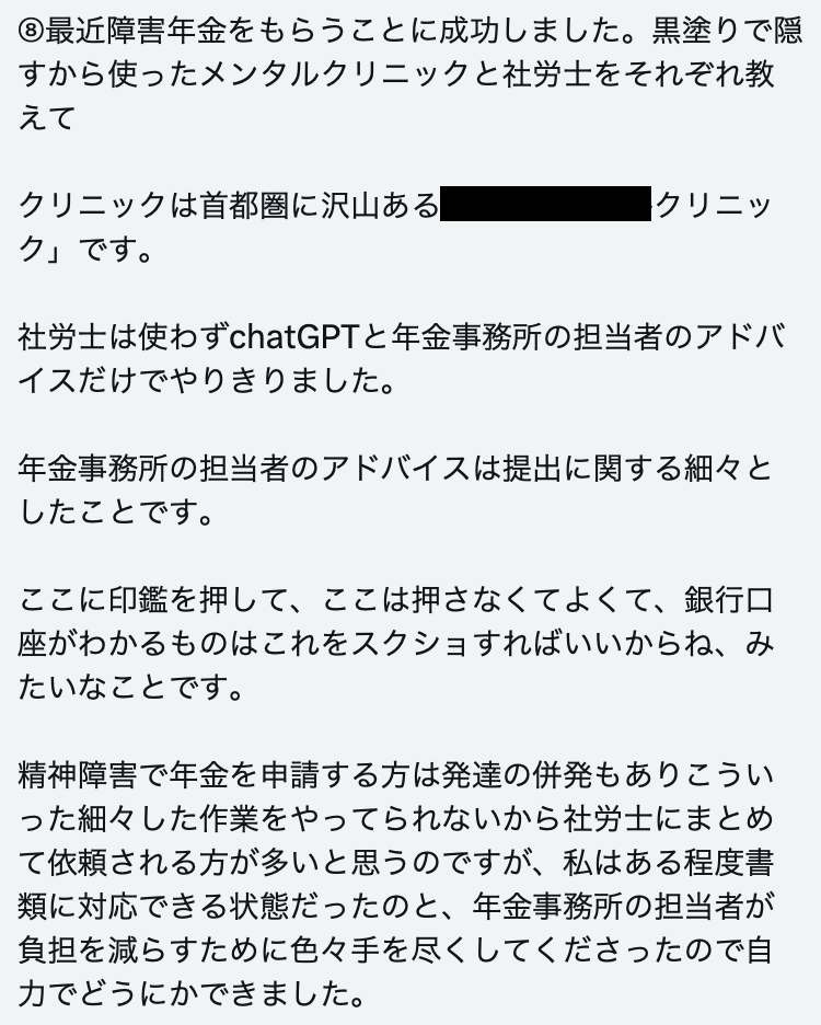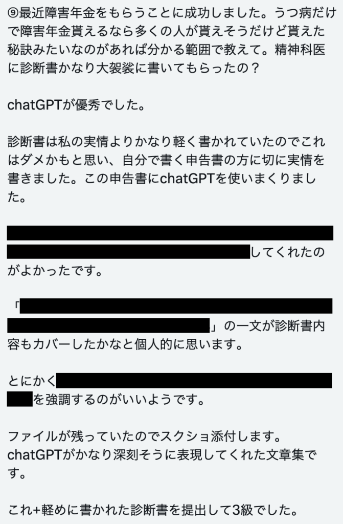 【診断書の内容が弱かったからchatGPTを使い倒して障害年金を勝ち取った女】大卒入社20代後半で年収340万円の女性から給与明細を買い取らせて頂きました。発達障害なしのうつ病のみで申請。障害年金を貰うためのchatGPTの活用方法と出来上がった全文も書いといたから参考にするように!とのことです。 pic.twitter.com/0XFb2kpYGy
