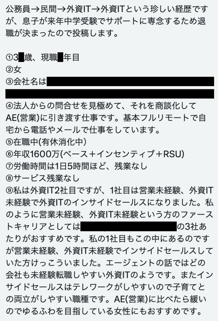 【ゆるふわ外資ITでインサイドセールスしてる元公務員1日5時間労働ママ】転職入社30代中盤で年収1600万円の女性から給与明細を買い取らせて頂きました。フルリモートで家からメールや電話で営業に商談をパスするお仕事。会社名書いといたから公務員→ゆるふわ外資ITに転職したい方は是非とのことです。 pic.twitter.com/4r8nQUCyPR