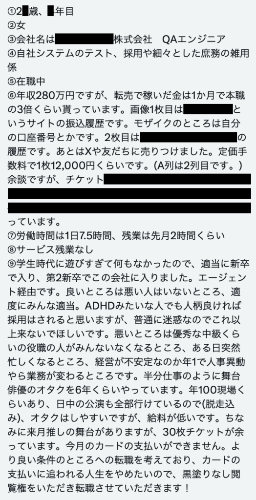 【チケット転売で本業の3倍稼ぐゴリゴリの舞台俳優オタク】転職入社20代中盤で年収280万円の女性から給与明細を買い取らせて頂きました。左のスクショのは全部12,000円で仕入れた。利益は各3万円くらい。今回はこれを再現できる5万円レベルの情報商材を書いといたから参考にするように!とのことです。 pic.twitter.com/R79ewZdCi1