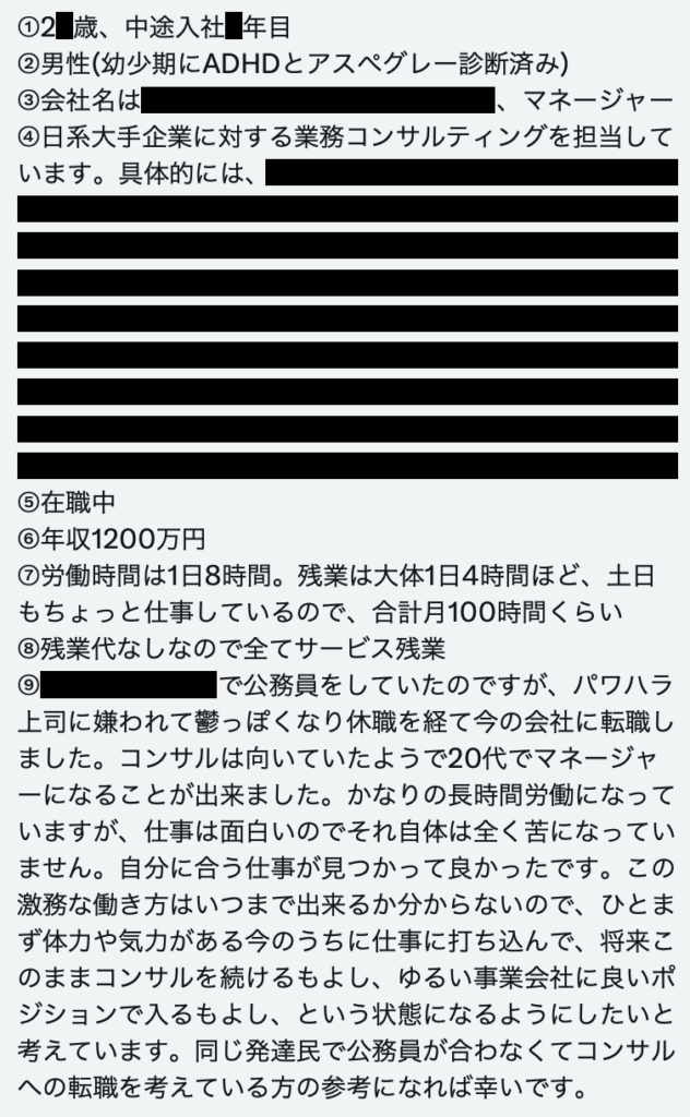 【コンサルに向いていた元公務員パワハラ被害者ADHDアスぺグレー男】転職入社20代後半で年収1200万の男性から給与明細を買い取らせて頂きました。公務員からコンサルに転職したら20代でマネージャーになれた。会社名も書いといたから公務員が合わない発達障害者は参考にするように!とのことです。 pic.twitter.com/VpV0ABo84Q